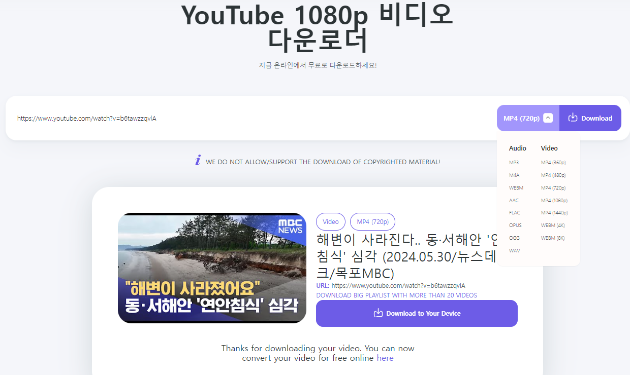 ✅ 아래는 사이트2 형태입니다. 마찬가지로 아래 박스에 유튜브 영상 주소를 입력하시고 파일형식을 선택하면 영상 파일을 다운로드 하실 수 있습니다.